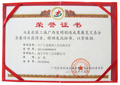 (本网讯)近日,经专家评审,第三届广西发明创造成果展览交易会评奖结果揭晓,我司参展项目“生产人造琥珀工艺品的方法”荣获本届成果展金奖。