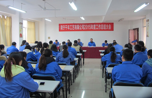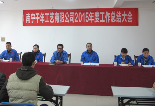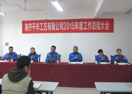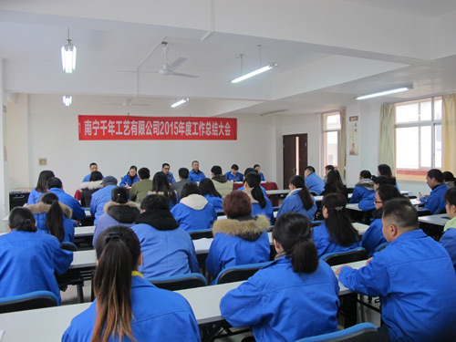 (本网讯)12月31日上午,在这辞旧迎新之际,南宁千年工艺有限公司在会议厅隆重召开2015年度工作总结大会!南宁千年工艺有限公司及旗下子公司:南宁千年虫工艺品有限公司、南宁艾珀居家文具用品有限公司、南宁千帆教学科技有限公司、南宁市黎明精细化学工业公司、中山市爱珀灯饰有限公司的主要管理干部共计50多人参加了本次大会。此次会议主要对2015年公司各项工作做了总结,并对2016年的重点工作进行部署,明确了下一年度公司的工作方向和经营目标。
