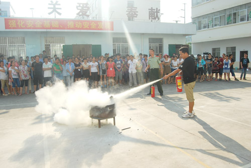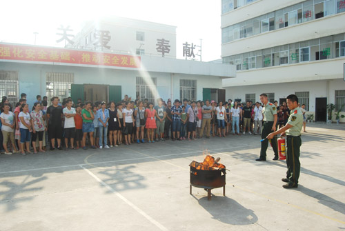 五、消防应急演练。邀请经开区消防中队消防专家临场示范教授突发火警时的逃生、灭火知识,并进行实战演练,让员工熟练使用消防器材,为安全生产增加保障。